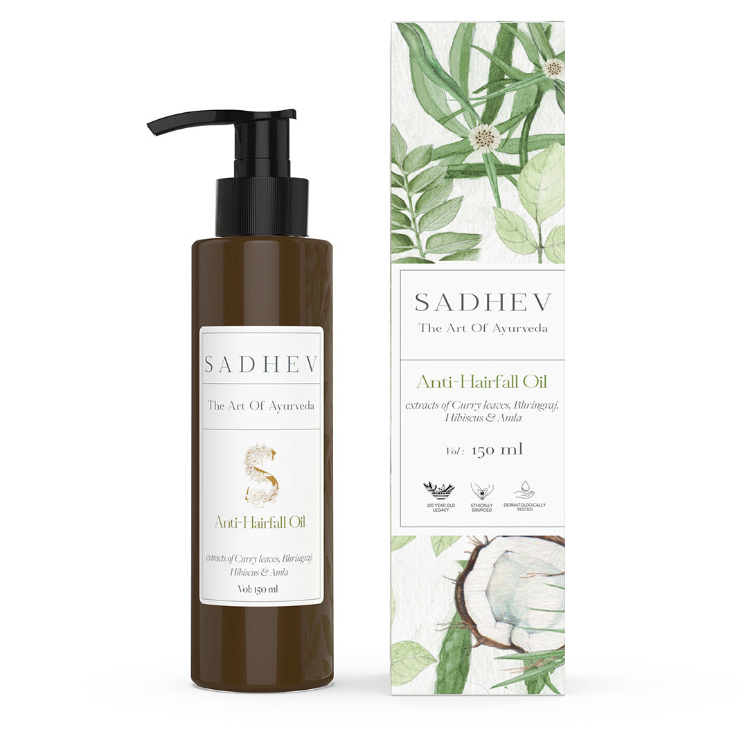 Sadhev's hair oils are crafted with a blend of Ayurvedic ingredients such as Coconut, Holy Basil, Clove Oil, Curry Leaves, Bhringraj etc., that are designed to nourish and rejuvenate your hair and scalp. The synergetic effect of these ingredients in our organic haircare product improves blood circulation, rejuvenates and revitalises hair.