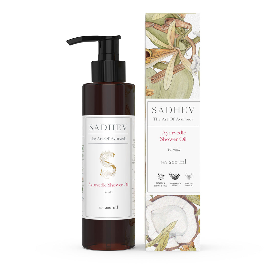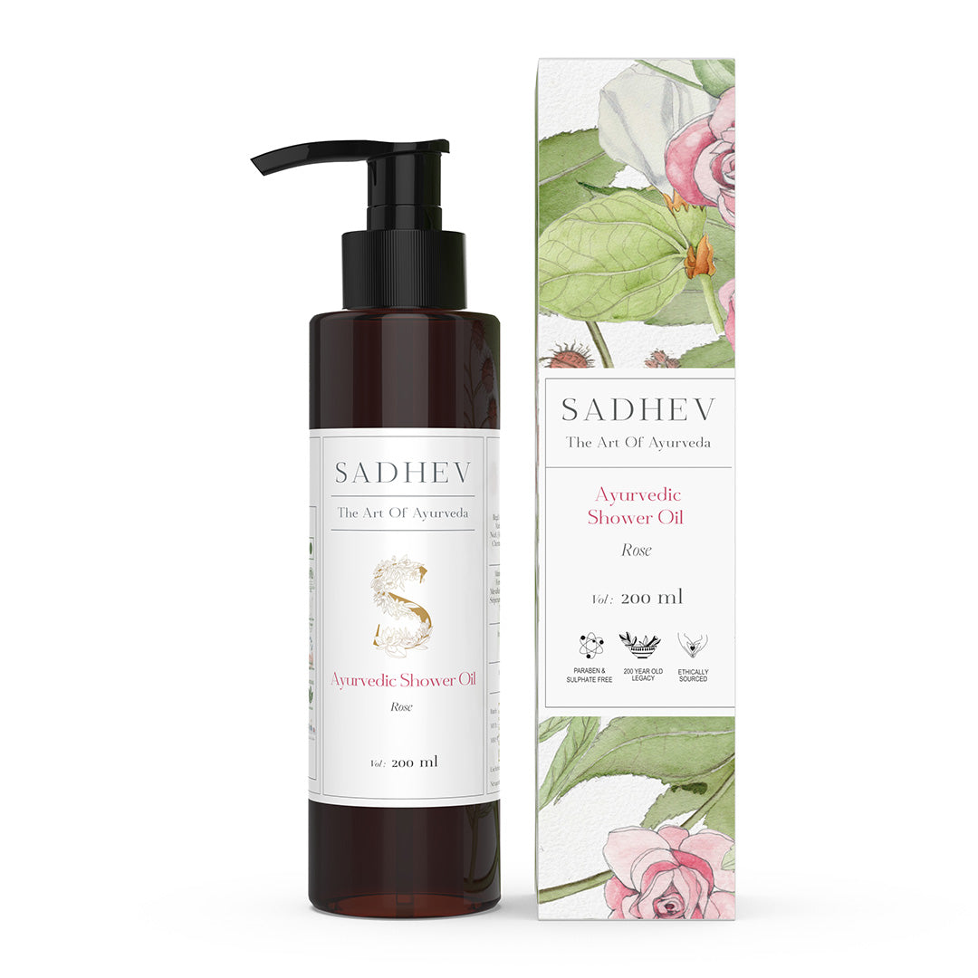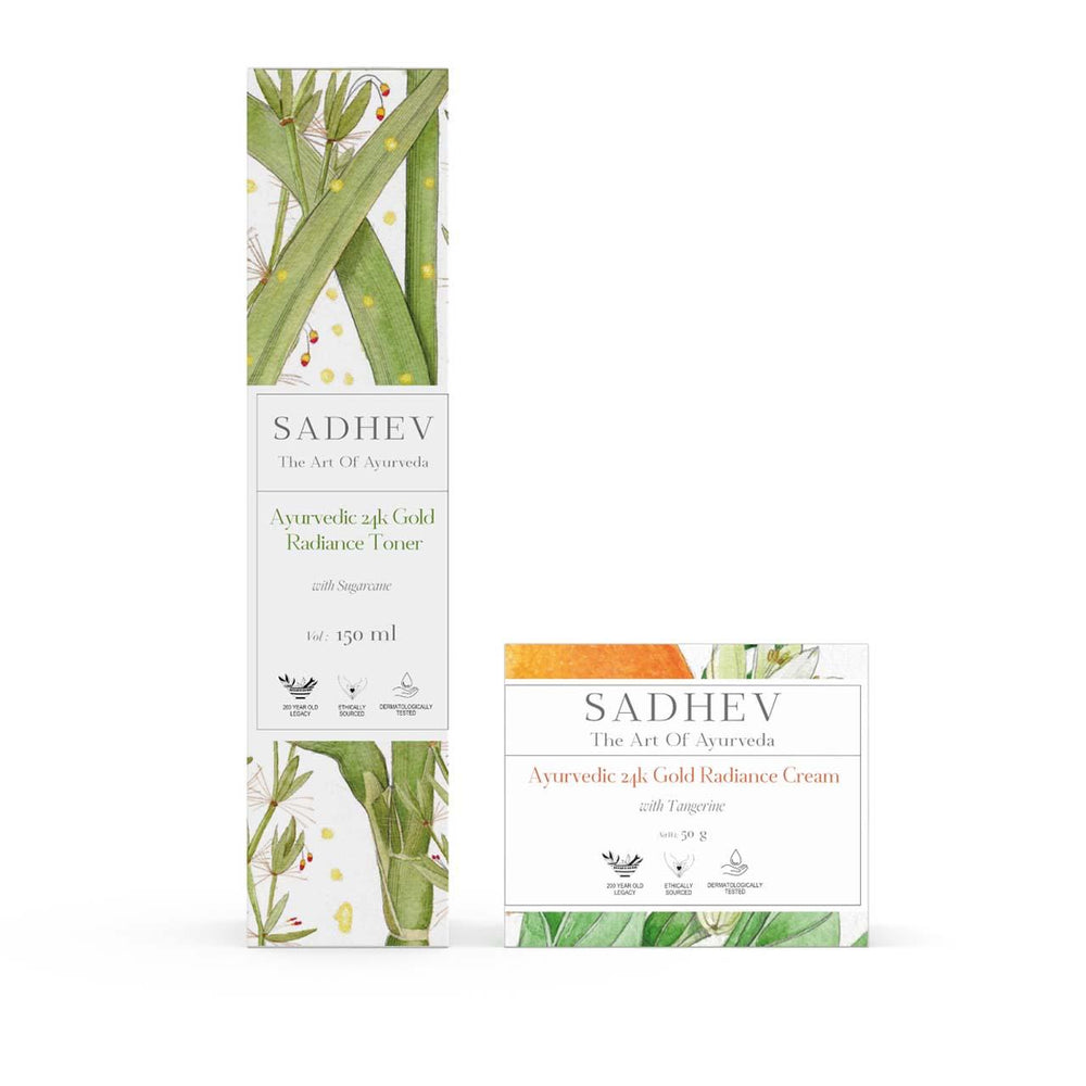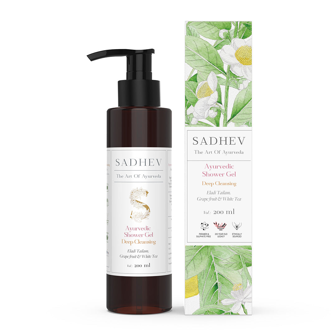 1. Cleanse - Use deep cleansing shower gel with natural ingredients like Shashtika Tailam, Juniper berries, etc. 2 Tone - Opt for pure rose water from Sadhev. 3. Work on specific skin concerns: Vitamin C Serum from Sadhev helps in reducing blemishes and imparts a gentle glow. 4. Moisturise: Apply a hydrating day cream. 5. - Use SPF 15 with Carrot, Indian madder and Licorice from Sadhev.