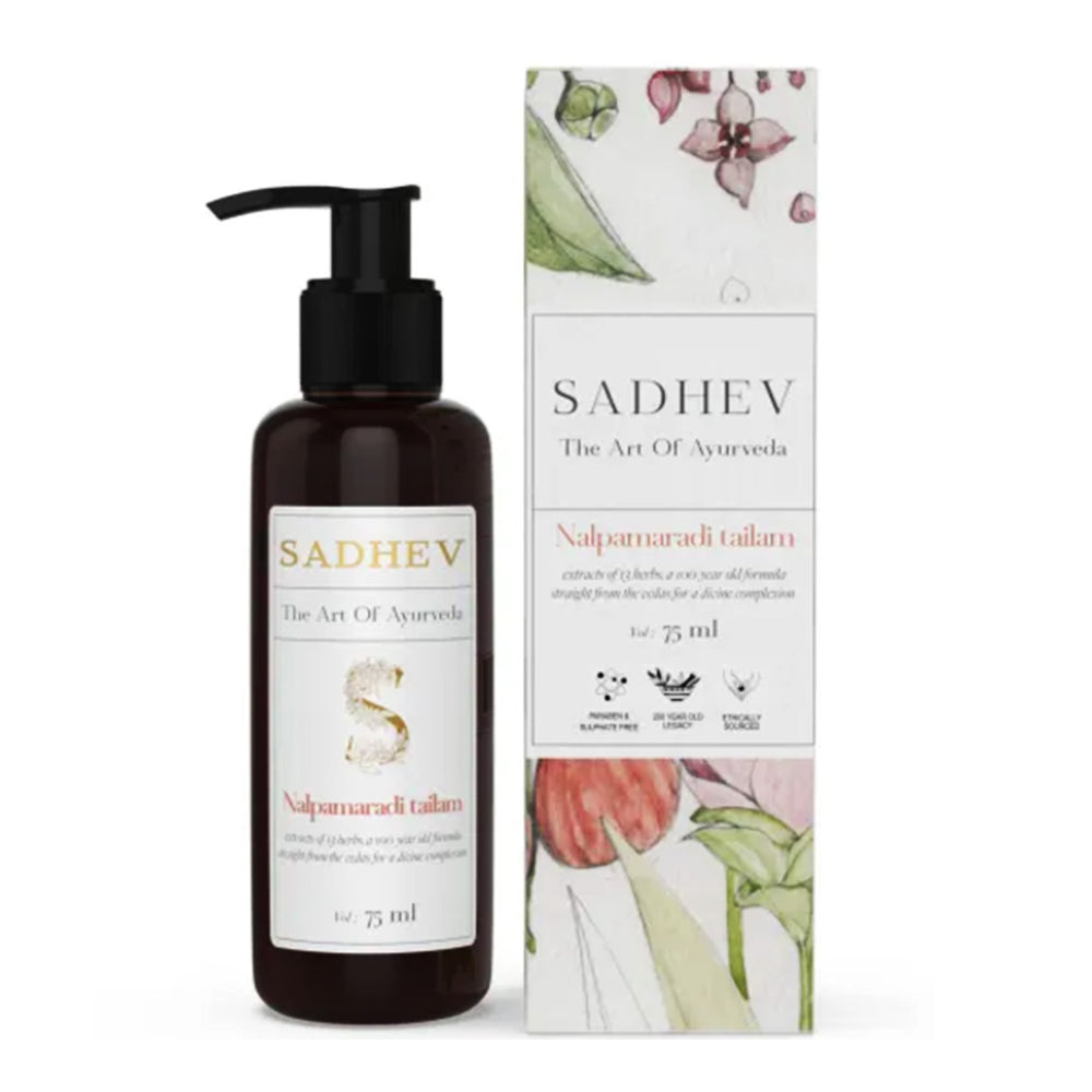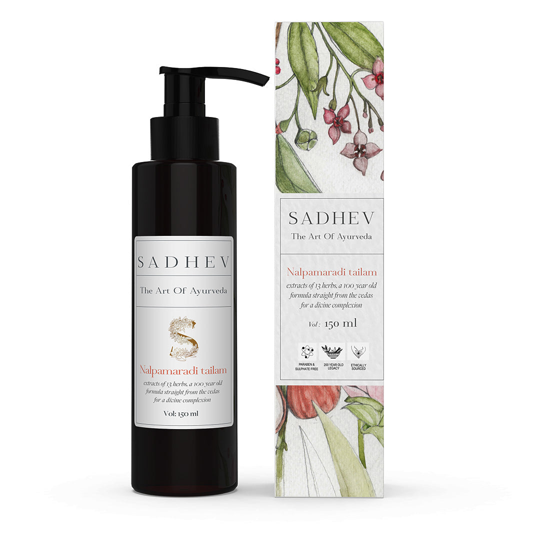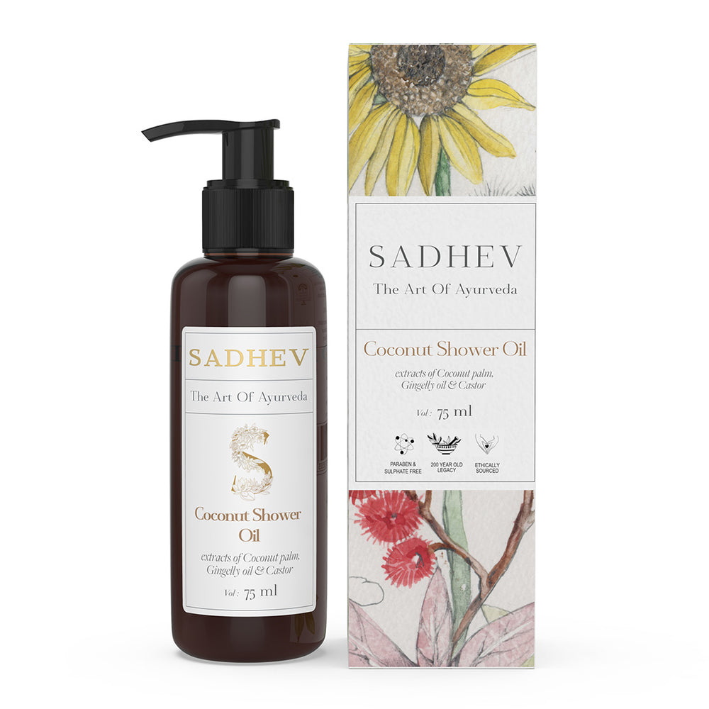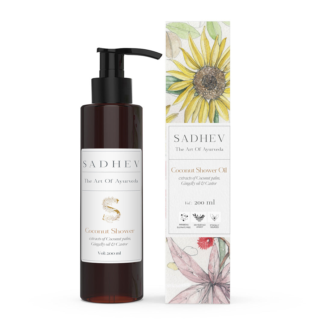 1. Cleanse - Use deep cleansing shower gel with natural ingredients like Shashtika Tailam, Juniper berries, etc. 2 Tone - Opt for pure rose water from Sadhev. 3. Work on specific skin concerns: Vitamin C Serum from Sadhev helps in reducing blemishes and imparts a gentle glow. 4. Moisturise: Apply a hydrating day cream. 5. - Use SPF 15 with Carrot, Indian madder and Licorice from Sadhev.
