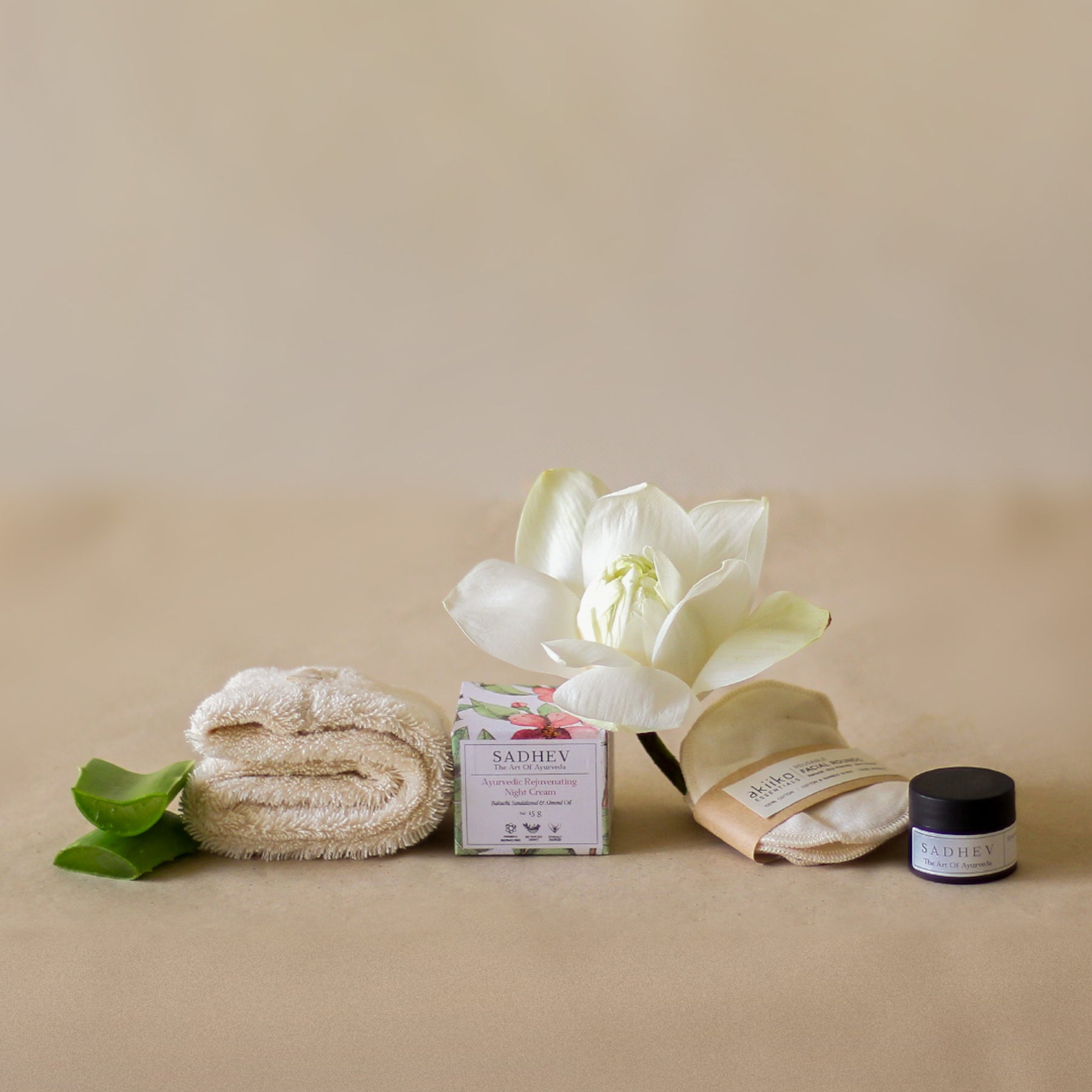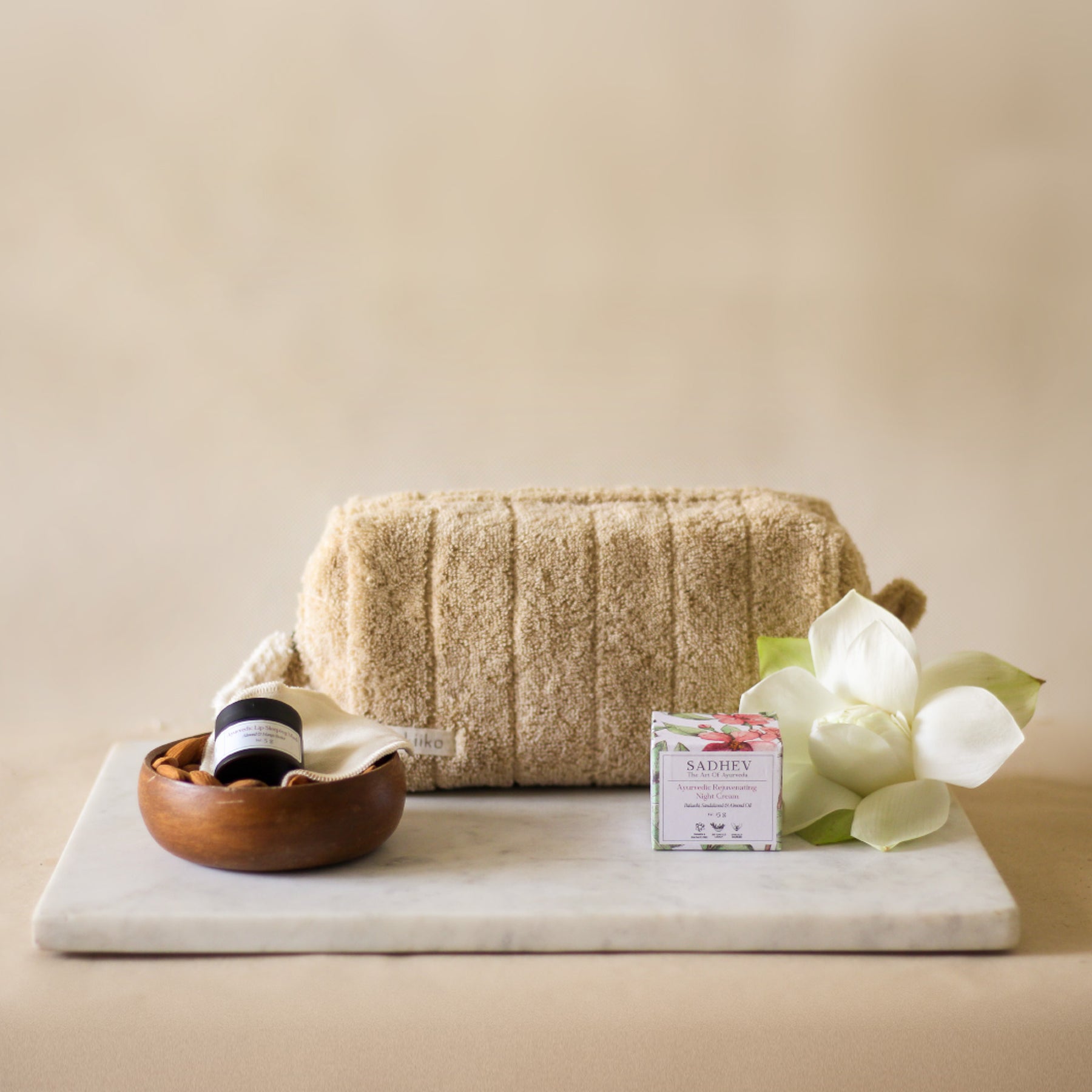 Rest Deeply invites you to slow down and sink into moments of calm. Sadhev’s night cream and nourishing lip mask work in harmony with akiiko’s terry essentials - a wheat dopp pouch, soft hair band, and reusable facial rounds, turning your nightly routine into a ritual of care and restoration.