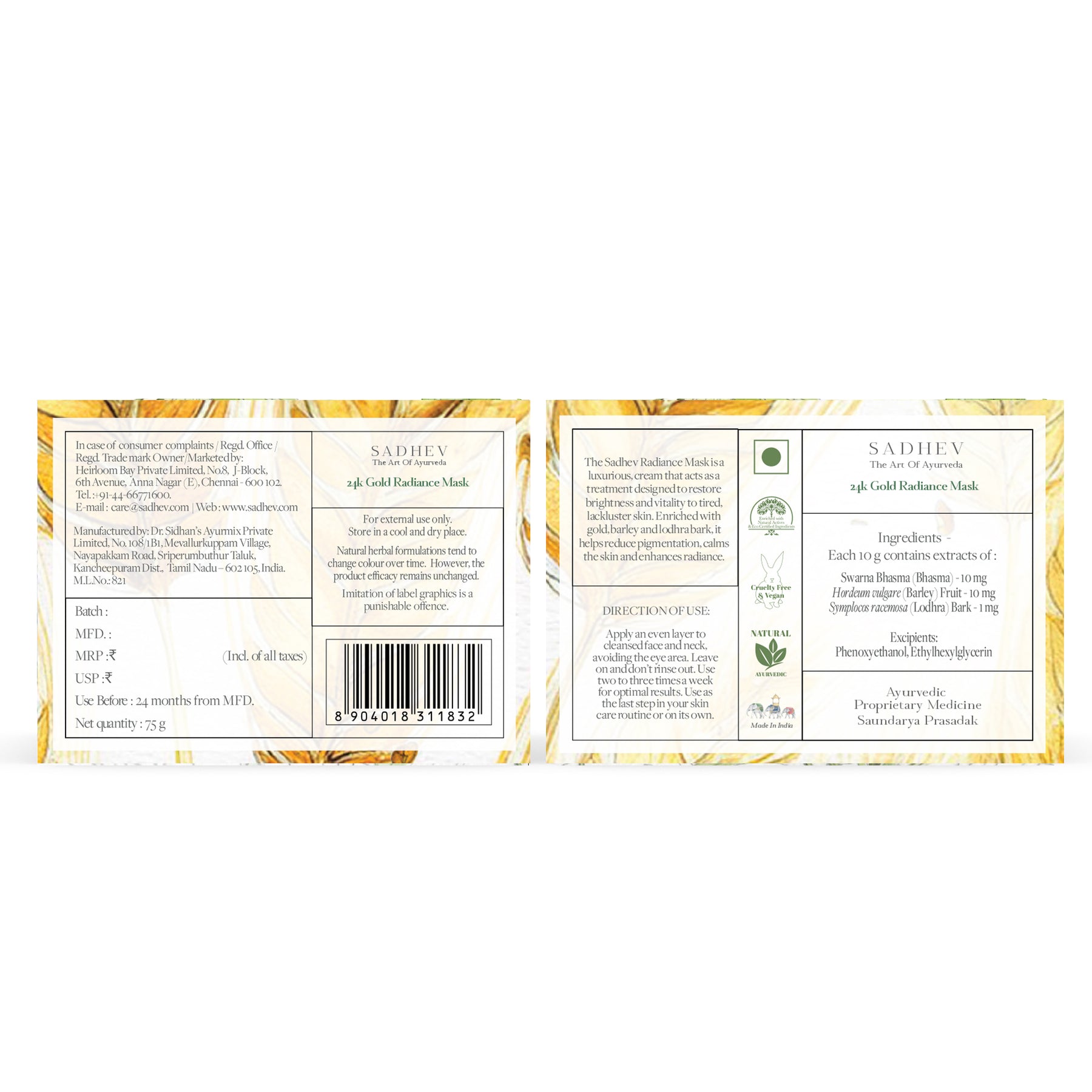 The Sadhev 24K Gold Radiance Mask is a luxurious cream that acts as a treatment designed to Restore Brightness and Vitality to Tired, Lackluster Skin. Enriched with Gold, Barley, and Lodhra Bark, it helps Reduce Pigmentation, Calms the Skin and Enhances Radiance.